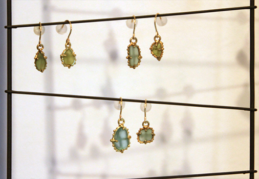 お店に飾っても違和感なくと言った感じです。ドイツテューテタイプのエコバッグは製作にあたってのコンセプトとしてはお店に飾ってもなじむデザインでした。デザインに関してはお店の写真や作品の写真、メッセージをカプセルボックスさんにお渡ししてデザインして頂きました。 ビーチグラスの指輪をリアルにイラストにして頂き、ロゴ、メッセージを組み合わせたデザインが出てきて一度でOKを出しました。 印刷の色なども相談に乗っていただき、ほとんどお任せするかたちにもかかわらず、予想以上に満足いくものが完成いたしました。