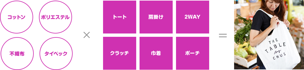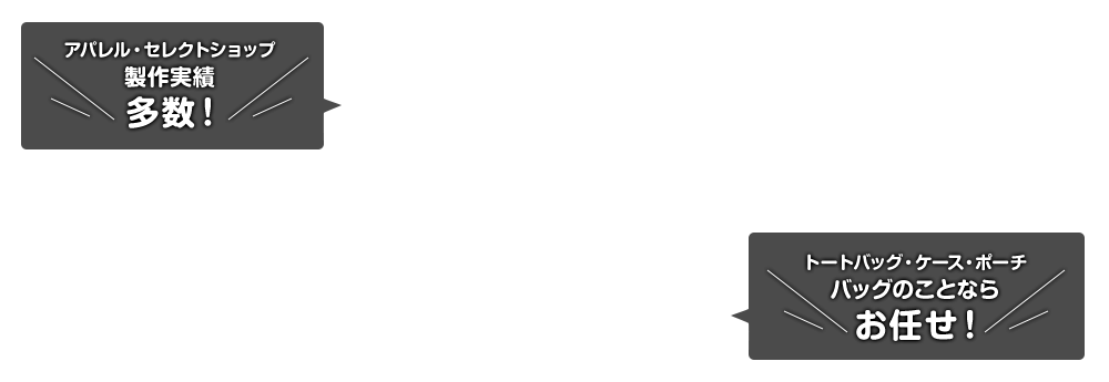 素材はコットン、ポリエステル、不織布、流行のタイベック®などをはじめ様々な素材をご用意しております。また、かたちもトートバッグからクラッチバッグ、ポーチなど、ご指定の仕様で製作可能です。チャックや裏地、PVC加工などのオプションなども対応可能です。そして、常に新しい素材などのを開拓し、お客様にご製作して頂けるサービスを提供できるように試作製作を常に行っております。