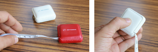 イベントなどの配布物は小さいということもひとつのテーマ。小さくても存在感があってもらって嬉しいアイテム、しかも高級感も欲しいというニーズにお答えしまして、レザー素材のメジャーを作成致しました。色は白、黒、赤がありますが、今回は赤と白で作成しました。表面にロゴをシルクプリントした、レザー素材のメジャーです。