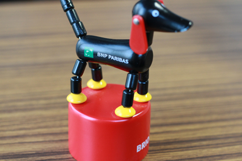 今回ご紹介するアイテムは、子供向けの木製おもちゃ。実は子供向けのおもちゃは人気がございます。持ち帰って子供にあげると喜ぶ、お父さん世代には有効なアイテムです。今回ご紹介するのはドイツの木製玩具メーカーのBRIOの起き上がりドッグに名入れをしました。そもそも本体の値段が高いものですので、ノベルティというよりはギフト寄りかもしれません。