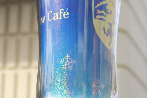 写真だとわかりにくいのですが、雪の結晶部分、空のグラデーションの下の白い部分がキラキラ素材になっております。キラキラは光の角度で見え方がかわりますので、写真だとわかりにくいです。左2つの写真、違いが分かりますでしょうか?タンブラーにセッティングしてみました