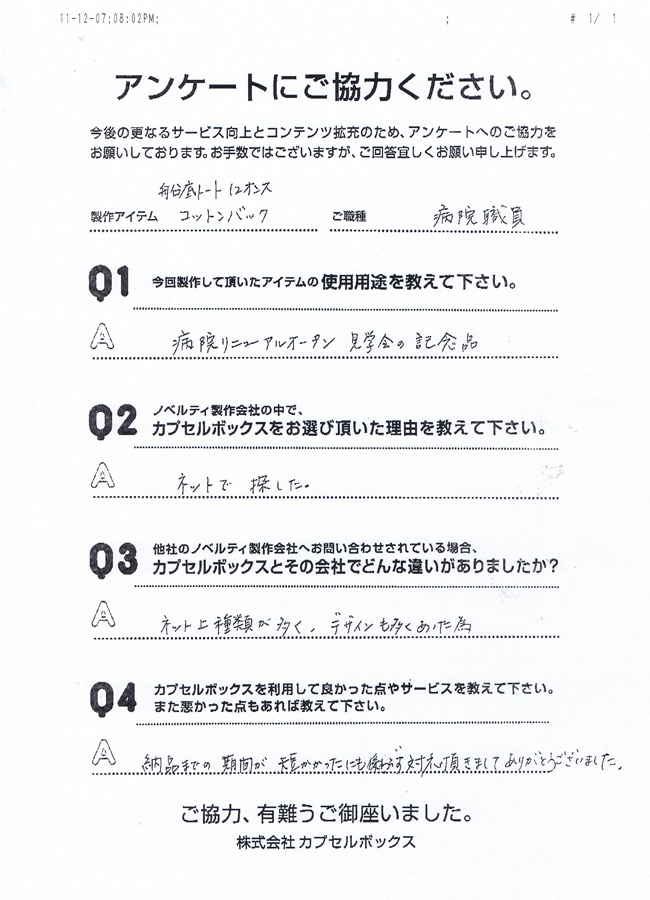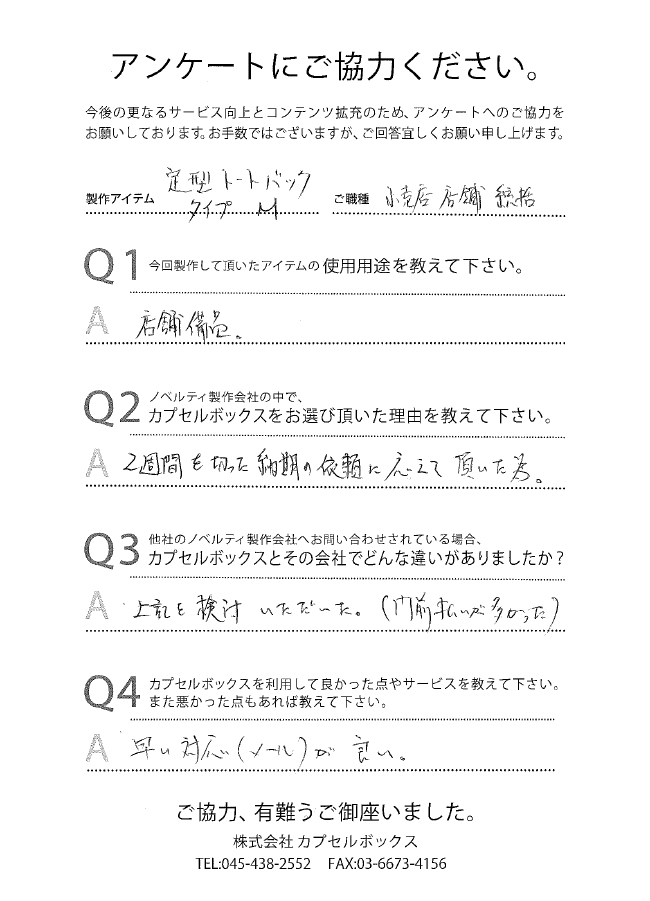 製作:トートバッグ ご職業:小売店 店舗 統括