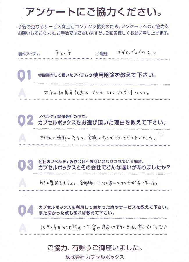 - Q他社のノベルティ制作会社へお問い合わせされている場合、カプセルボックスとその会社でどんな違いがありましたか?