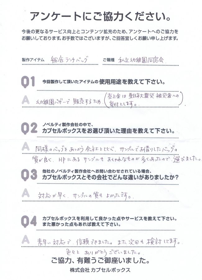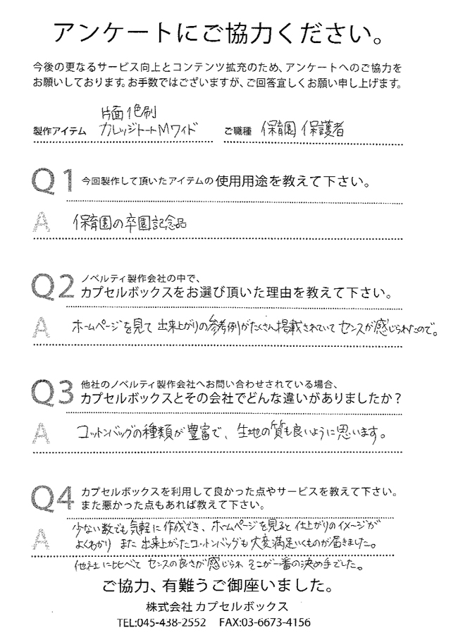製作:トートバッグ ご職業:私立幼稚園同窓会