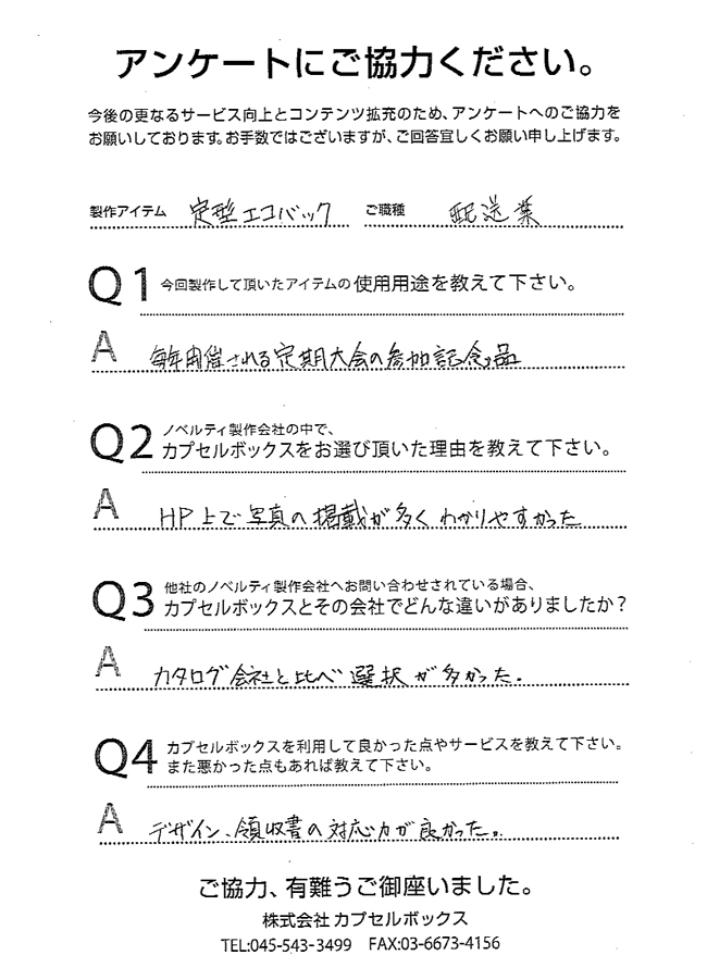 - Aエコバッグのサイズ、素材、完成までの納期が求めていたものと一致したから。